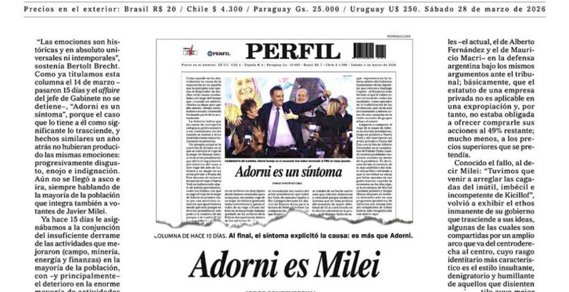Hace un mes, un conocedor de la política de las últimas décadas dijo en privado: “Menem subía al avión presidencial de todo, hasta …, y no puedo creer porque la esposa del jefe de Gabinete lo hiciera se arme semejante escándalo”. Hace algunas semanas, una ciudadana común, también en privado, dijo: “Lo acusan a Adorni de haber escriturado su departamento por menos valor, pero si todos los argentinos escrituramos por menos”. Esta semana, periodistas oficialistas resaltan que la Justicia no avanza con la misma rapidez en la investigación por corrupción de Adorni que en otros casos; el ejemplo usado fue Insaurralde. Y recién antes de ayer, un mes y medio después, Infobae titula un artículo, “No es (solo) Adorni: datos sobre la caída de imagen de Milei”, donde por primera vez registra que “la caída de imagen de Milei empezó antes del caso Adorni. El Índice de Confianza en el Gobierno de la Universidad Di Tella acumula tres meses consecutivos de baja: −2,8% en enero, −0,6% en febrero y −3,5% en marzo, con una contracción acumulada del 6,5% desde fines de 2025”.